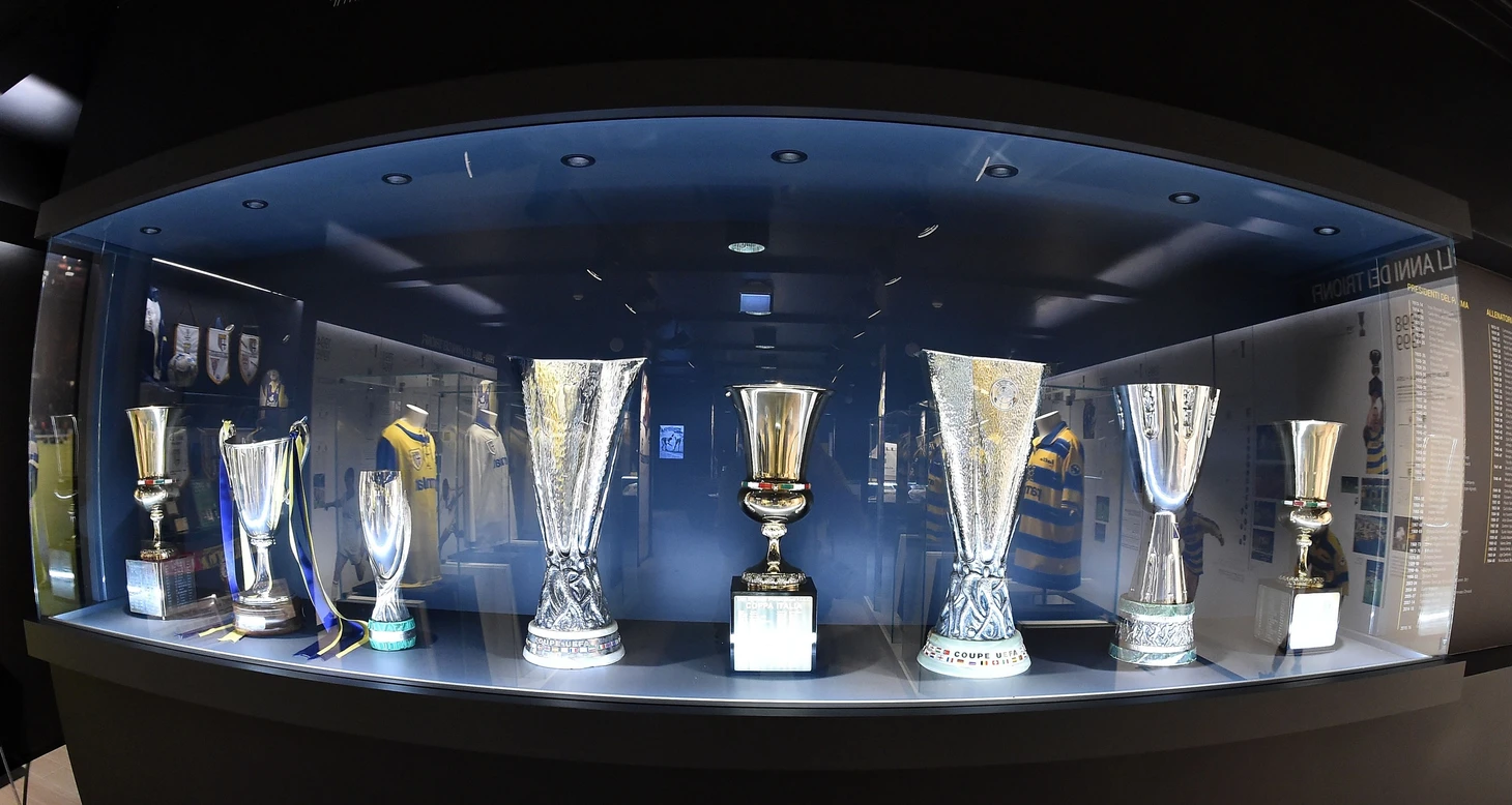 Был период, когда в музее не горел свет, а полки пустовали. Очередной финансовый крах, поразивший клуб - и эти 8 красавцев были проданы на аукционе. Образы величия «Пармы» стали символами ее падения. К счастью, сегодня всё на месте. Трофеи стоят в музее и вновь блестят, как блистали когда-то crociati.