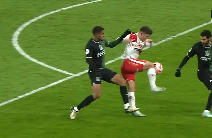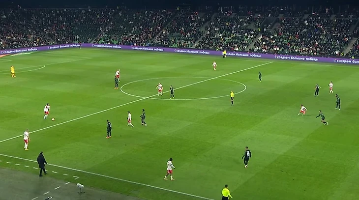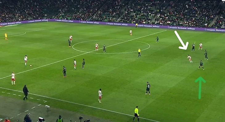 2) Спартаковец не бежит в зону сразу, а создаёт себе больше пространства. А именно: делает ложное открывание на несколько метров в сторону игрока с мячом и резко стартует в обратном направлении. На фото из трансляции четко видно, как Коста (ЦЗ «Краснодара») попался на это ложное движение и остаётся на опорной ноге, в то время как нападающий красно-белых уже начал движение ему за спину.