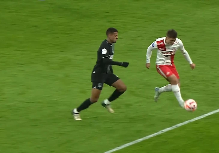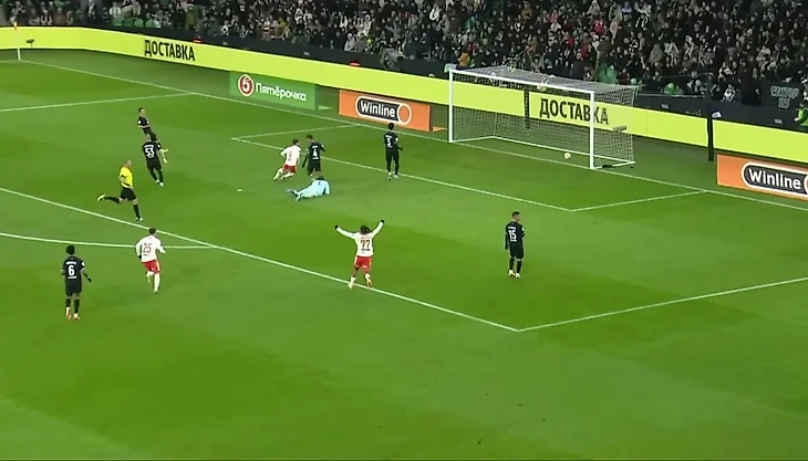 4) После, он отрывается от ЦЗ «Краснодара», успевая увидеть, куда летит мяч.