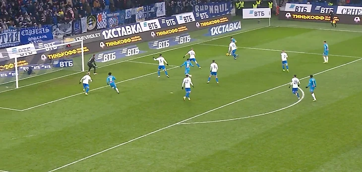 На главный вопрос матча – какое же построение выбрал Семак в защите – ответа в первом тайме мы не получили. При начале атак Барриос постоянно опускался на позицию центрального в тройке, а его позицию при обороне определить оказалось трудно: Динамо практически не атаковало, но об этом ниже.