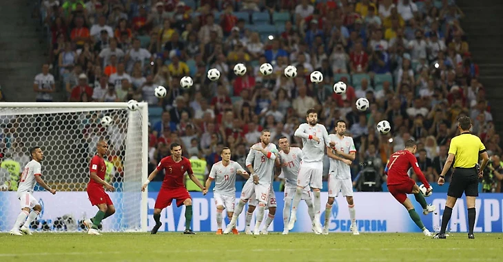 Нет, с пенальти у КриРо только два гола (Ирану и первый испанцам), при этом ещё один он положил с того самого штрафного – опять с Испанией.