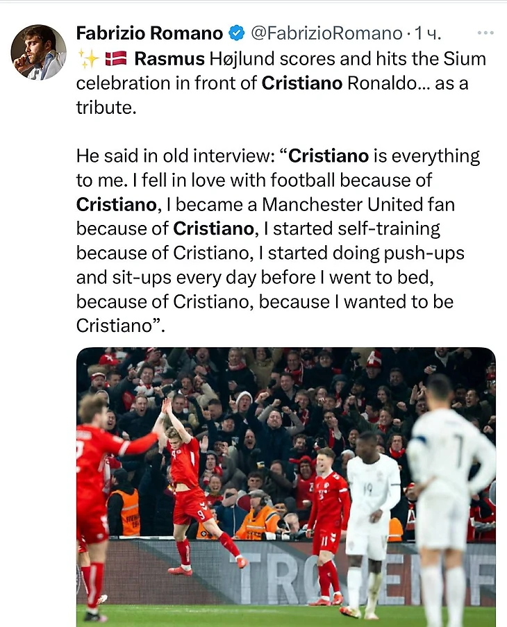 Чтобы хоть немного поумерить пыл интернет-публики, пришлось подключать тяжелую артиллерию: Фабрицио Романо откопал кусок из прошлогоднего интервью Хейлунда, в котором тот признавался в своей горячей любви и абсолютном уважении к Роналду, по сути называя его своим кумиром: «Криштиану был для меня всем. Я влюбился в футбол из-за Криштиану, я стал фанатом «Манчестер Юнайтед» из-за Криштиану, я начал заниматься персонально из-за Криштиану, я начал отжиматься и приседать каждый день перед сном из-за Криштиану, потому что я хотел быть как Криштиану».
