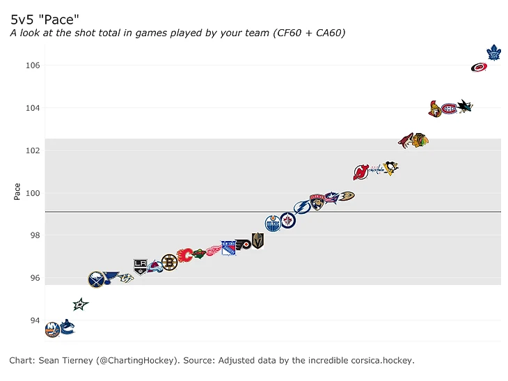 Этот график показывает суммарное количество бросков совершаемых командой по чужим воротам и количество бросков допускаемых этой же командой по своим воротам в равных и полных составах из расчета 60 минут игры. Здесь "Торонто" со 107 бросками впереди лиги всей. Но это вовсе не означает доминирование. Например, у "Тампы" этот показатель 99 бросков, но при этом соотношение бросков по чужим и своим воротам в пользу "молний" + 10, что значительно лучше, чем у "Торонто". Это говорит о том, что "Тампа" в сравнении с "листьями" меньше бросает сама, но и значительно меньше дает бросать сопернику, то есть контроль "молний" над игрой получается выше.