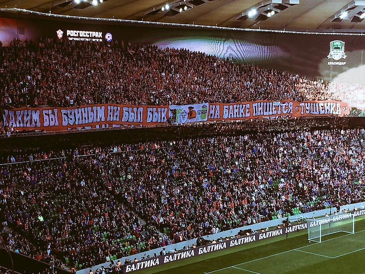 Выяснилось, однако: одно из официальных лиц матча, прибывшее из Москвы, попросило санкцию на баннер под свою ответственность, заявив: фото у него нет, но полотнище шуточное, согласованное в РФПЛ, все будет нормально. Теперь «Краснодар» приходит к выводу: чувство юмора все-таки штука индивидуальная. То, которым обладает официальное лицо, клуб не слишком устроило.