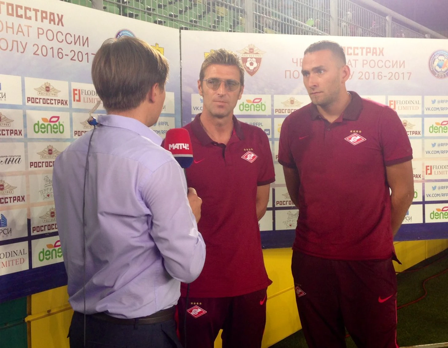— Конечно, все очень рады. Тем более я родом из Электростали, где большая часть друзей реально болеет за «Спартак». Раньше я особого значения этому не придавал, а когда меня взяли в команду, позвонил одному другу, болельщику, и в шутку ему говорю:— Кто тренер в Спартаке?— Аленичев. (Это еще в августе дело было).— А че там, итальянца какого-то взяли?— Да, помощником в оборону.— А я буду его переводчиком, прикинь?— Да ну на***?!?!— У тебя нормированный рабочий день?— Да, вполне. Жена очень завидует моему графику. Очень завидует.