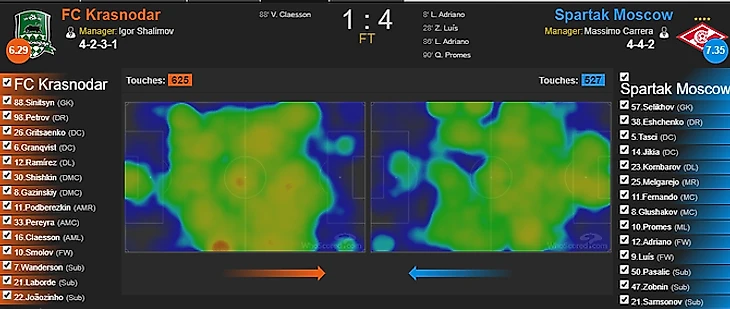 Если кому-то кажется, что игра проходила иначе, смотрите статистику и диаграммы. Обратите внимание, как истоптана наша штрафная, как мало нашей активности в средней зоне в последней трети поля, насколько свободны подступы к штрафной соперника и какой скромный пятачок мы протоптали у чужих ворот. А теперь итоговая цифра - четырнадцать голевых ситуаций в штрафной "Краснодара". Нет, не так. ЧЕТЫРНАДЦАТЬ! И все они практически без сопротивления. Это выдающаяся игра в атаке, это точнейшие и смертельные удары большого мастера. При всём уважении к сопернику. С нами интересно играть в открытый футбол, но опасно. Как справедливо заметил один наш уважаемый болельщик, "можем насыпать". Вот и насыпали.