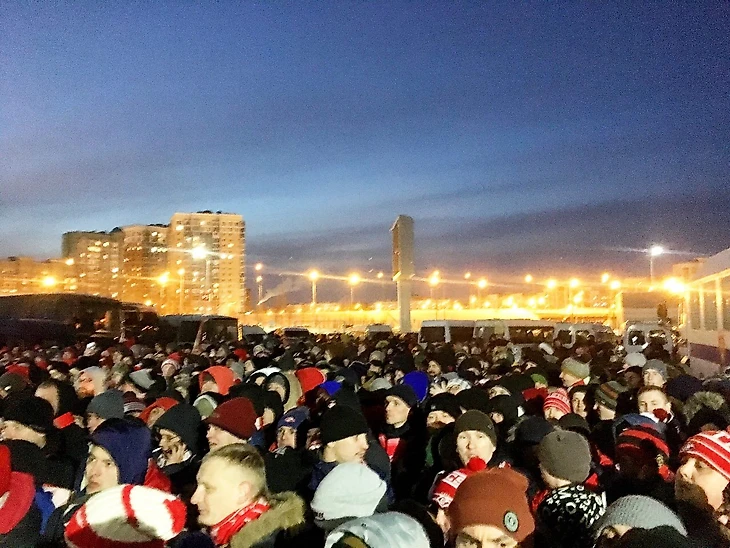 При этом еще до начала матча в соцсетях стали одно за другим появляться жалобы спартаковских болельщиков на работу полиции и стюардов, которые осуществляли досмотр при входе на гостевую трибуну крайне медленно. Очередь почти не двигалась. А на улице было, напомню, минус 16! При этом в толпе было много детей и женщин. Образовалась давка. Люди писали, что простоять пришлось около часа, кому-то разбили телефон. А еще объединили мужской туалет с женским.