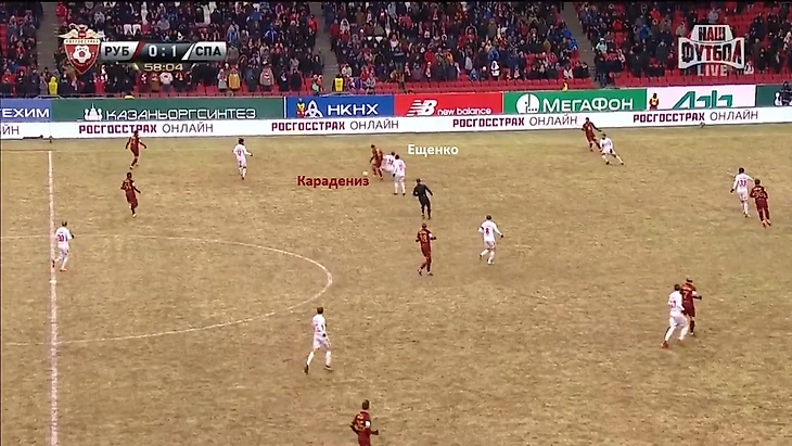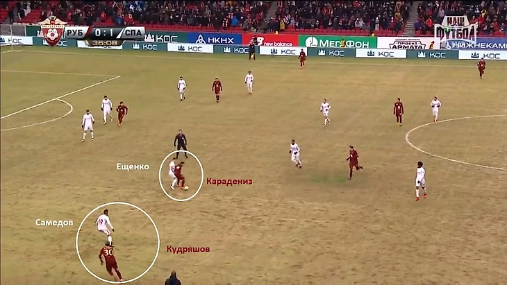 Был еще в атаке у «Рубина» нападающий Жемалетдинов. С учетом игры Ещенко по Гекденизу и отвалам турка к левому флангу, на Жемалетдинова оставалось два защитника - Максимович и Кутепов.