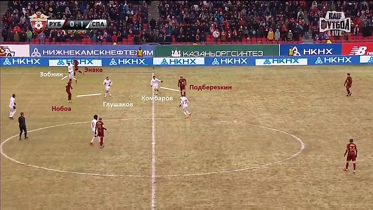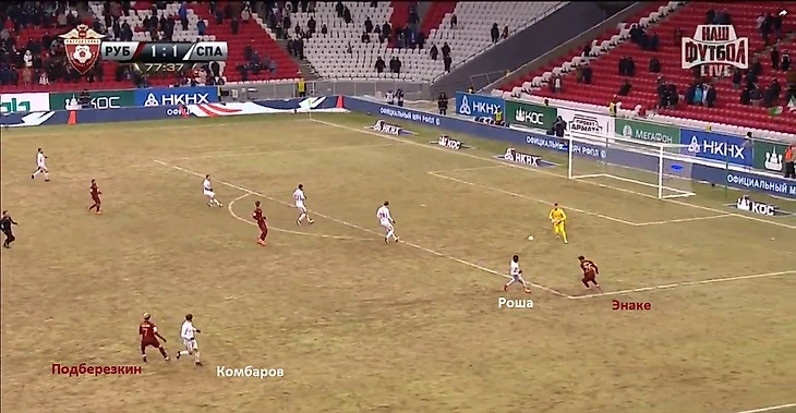 Слева Дмитрий Комбаров отвечал за Вячеслава Подберезкина. Чтобы его зону за счет ложного открывания никто не вскрыл, Зобнин был приставлен к латералю Энаке.