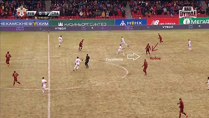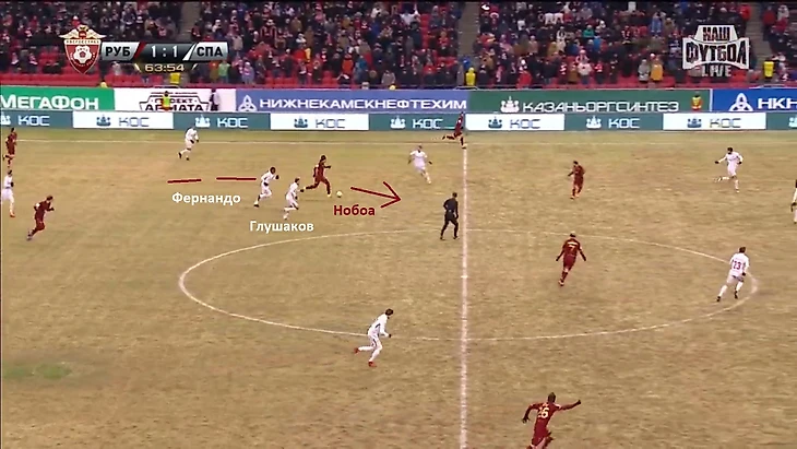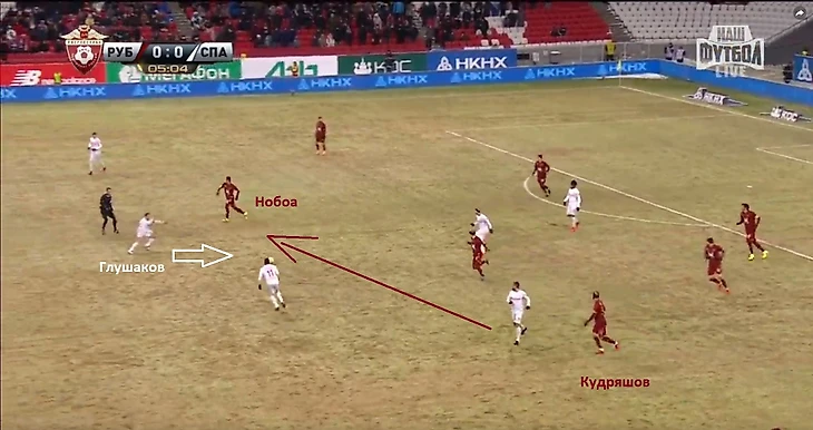 Против мозга «Рубина» - эквадорца Кристиан Нобоа - у «Спартака» действовал Денис Глушаков. Как правило, он летел на соперника в момент передачи. Один раз за первый тайм Денис отобрал мяч у легионера, три передачи на него перехватил. Важна именно статистика за первый тайм - об этом ниже. Могилевца прихватывал либо один из нападающих («Спартак» использовал схему 4-4-2), либо Фернандо - жестких рамок не было.
