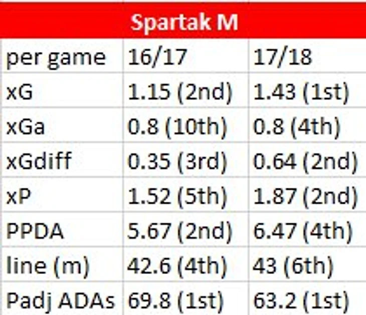 Спартак допускает столько же сзади, сколько и в прошлом сезоне, и значительно больше создает - тем самым баланс и отставание от первого команды по балансу значительно улучшены. Только теперь реализация развернула их уже в другую сторону - команда пропускает значительно больше ожидаемого, в отличие от прошлого сезона, и не реализует свои моменты так хорошо. И так же Спартак идет в значительно более быстром темпе по expected points/game - значительно ближе к тому, что можно назвать чемпионской командой.
