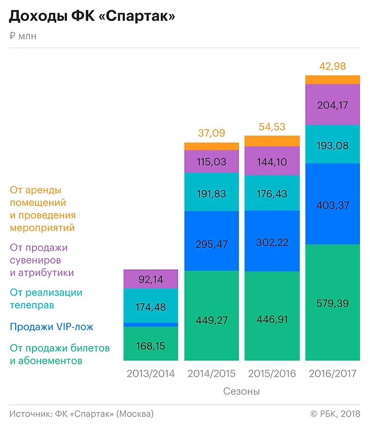 Сопоставимую сумму принесла и продажа VIP-лож. В том же сезоне VIP-болельщики заплатили за лучшие места на арене 403,4 млн руб. Совокупно продажа билетов, абонементов и лож на стадионе «Открытие Арена» позволили «Спартаку» заработать 983 млн руб. за сезон. Почти такую же сумму (1 млрд руб.) называл президент «Спартака» Леонид Федун в 2014 году перед открытием стадиона как ожидаемый годовой заработок от продажи билетов.