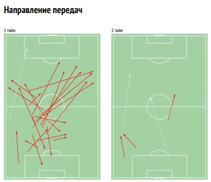 Видно, что Андрей старался выносить мяч в одну зону — правый фланг и полуфланг, где за мяч цеплялись Ерохин и Фернандес. Тут важна карта передач со стандартных положений (то есть с выносов от ворот), с игры Лунев под прессингом порой выбивал мяч просто в сторону атаки, здесь же видно, что при ударе по статичному мячу он целенаправленно направлял мяч в определенное пространство. Однозначно, это было заданием от Черчесова и, судя по проценту точных передач и работе правого фланга, Лунев помимо игры на ленточке справился на отлично и с этой задачей.