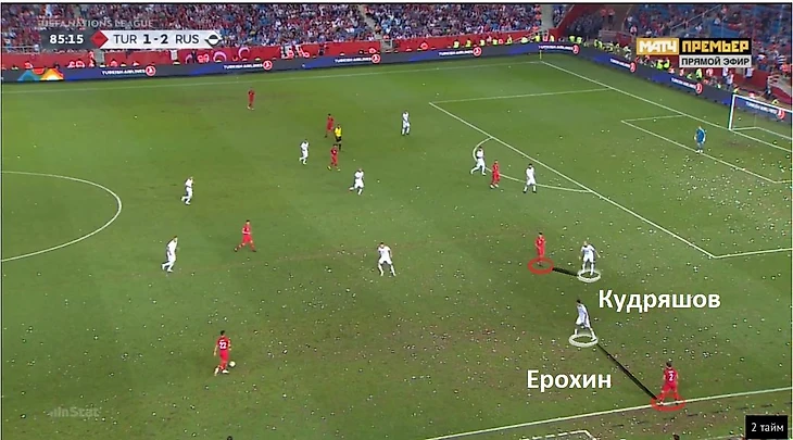Ерохин стал спасителем-суперменом и в концовке игры, когда сборная России выдохлась и функционально сильно просела. Озбайраклы и Ундер издевались над Дмитрием Кудряшовым, который из-за слабой позиционной отработки в обороне Черышевым оставался один сразу против двух игроков соперника.