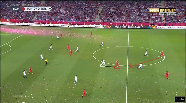 Здесь все не очень однозначно, но виден один вектор — сборная России применяет прессинг ситуативно, в зависимости от соперника. Центральные защитники сборной Турции слабо двигали мяч вперед, потому Дзюба и Кузяев редко вступали в активный прессинг, давая Сеюнджу и Азизу (во втором тайме и Айхану) перекатывать мяч на своей половине поля, главной их задачей было не дать развить атаку через центр и довести мяч до главного мозга команда Хакана Чалханоглу.