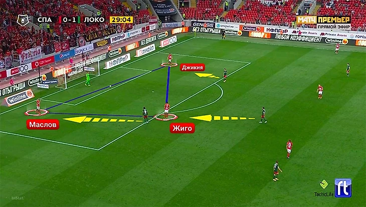 Любопытный момент случился на 30-й минуте. Первоначально «Спартак» оказался под давлением, но за счёт смены позиции Жиго, который опустился прямо к вратарю и прогнал чуть выше Маслова и Джикию, «Спартак» всё же разыграл мяч.