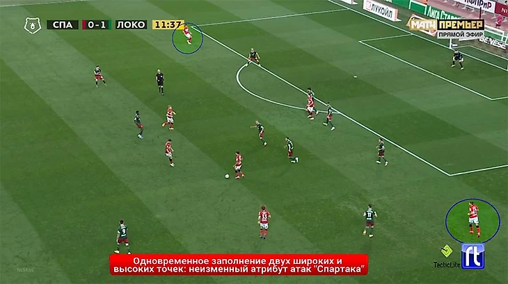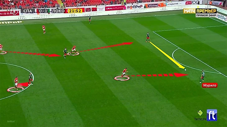 Команда должна растягивать чужую оборону, для этого оба латераля, Зобнин и Айртон (или кто-то другой по ситуации – Крал или Бакаев) должны открываться за спинами дальних защитников. В итоге сопернику для контроля либо приходится опускать в четвёрку одного хавбека (но тогда становится свободнее в центральной зоне), либо реагировать и смещаться по факту заброса на бровку. Резкие смены направления атак – фирменный стиль сегодняшнего «Спартака».
