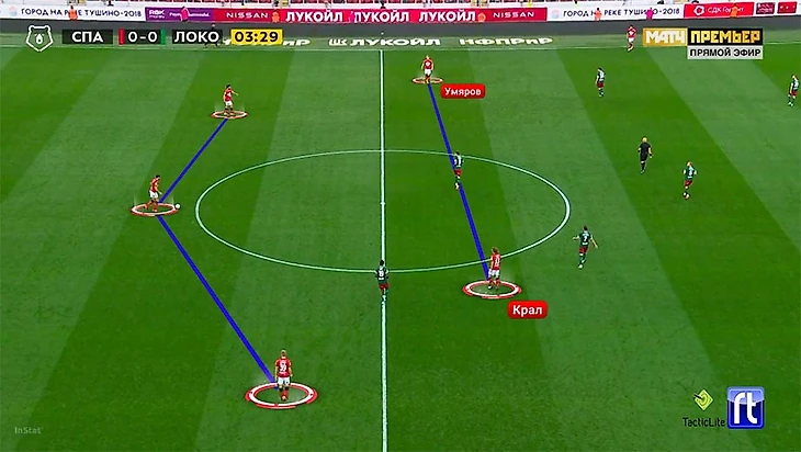 Уже третий тур подряд Тедеско играет с двумя опорными полузащитниками, Кралом и Умяровым. Когда Наиль наконец-то пришёл в себя после травмы (в концовке прошлого сезона он играл слабо) и набрал форму, сразу же стало понятно, как позитивно он влияет на позиционную структуру команды. Теперь у «Спартака» больше возможностей строить футбол через контроль и выход в атаку за счёт коротких и средних передач, поскольку раньше над центральными защитниками бегал и закрывался (открываниями это назвать было нельзя) одинокий Крал, а «восьмёрки» поднимались высоко в полуфланги.