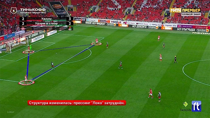 Индекс PPDA (количество пасов соперника на одно успешное оборонительное действие) составил для «Спартака» 7,7 по версии Wyscout – отличный показатель! Во многих матчах прошлого сезона было от 15 и выше. Точность передач у «Локомотива» — 76%, доля длинных пасов – 12%, — всё это как раз прямое следствие прессинга.