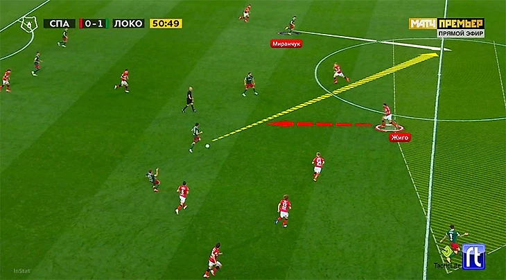 Важный вопрос: не пострадала ли из-за перевода Бакаева в более высокую позицию оборонительная фаза? Количество полузащитников в опорной зоне уменьшилось, но пока «Спартак» компенсировал это, во-первых, изменившимся стилем обороны и поднятой средней линией (об этом – в пункте 4), во-вторых, Жиго стал покидать место самого центрального в тройке и агрессивно атаковать соперников в опорной зоне ещё чаще. Тем самым проблема нехватки объёмного опорника маскируется, хотя понятно, что это всё равно риск.