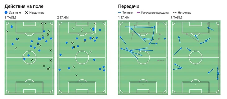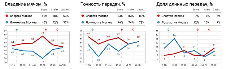 В матче с «Локомотивом» доля длинных передач составила всего 7% (у соперника – 12), а общая точность передач – 83%, что выше средней отметки в 80%.