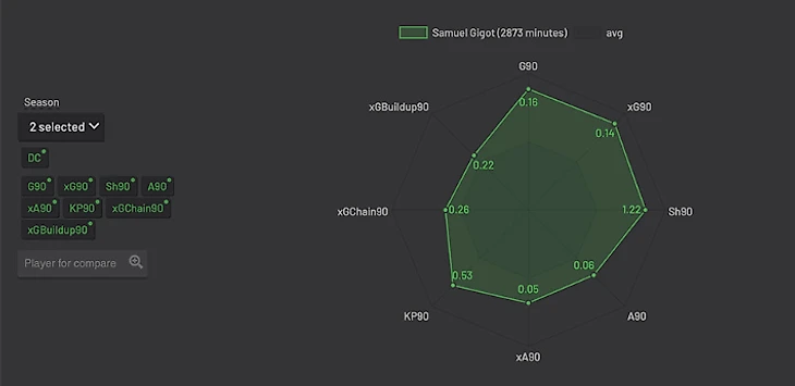 В двух последних сезонах у Жиго приличные для центрального защитника цифры почти во всем атакующим метрикам, будь то ожидаемые голы (xG90), голы (G90), удары (Sh90), прямой вклад в опасные атаки (xGChain90) и непрямой вклад (xGBuildup90, в показателе исключаются собственные удары и ассисты).