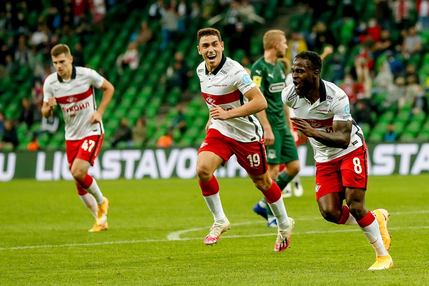 Роман Зобнин (слева на заднем плане), Эсекьель Понсе и Виктор Мозес сразу после дебютного мяча нигерийца за «Спартак» Фото: Александр Ступников, «Спартак»