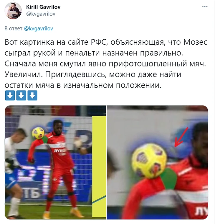 Даже просматривая видеоповторы, можно долго дискутировать о том, в какое конкретно место попал мяч Мозесу, поэтому в РФС нашли нетривиальный способ убедить всех в своей правоте. Они воспользовались фотографией одного из наших коллег, которая вызывает еще больше сомнений в правильности назначения пенальти, и… отфотошопили ее по своему усмотрению. Это хорошо заметно, потому что монтажер, «передвигая» мяч с ключицы полузащитника дальше по руке, сделал свою работу грязно – на месте старого изображения остались следы мяча.