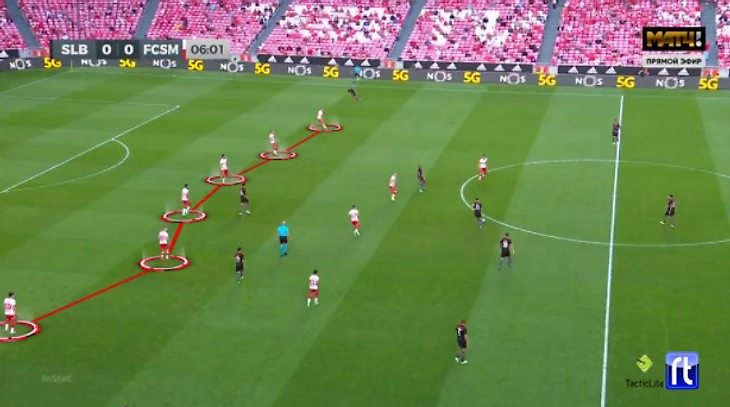 В Москве «Спартак» выстроился по схеме 4-3-3 для того, чтобы пытаться встречать соперника высоко и агрессивно. Тройка нападающих играла один в один с чужими центральными защитниками, две «восьмёрки» брали чужих опорников, крайние защитники по факту передачи выдвигались на латералей. На бумаге всё это выглядело красиво, но по факту «Бенфика» почти не почувствовала спартаковский прессинг. Уровень интенсивности и технического оснащения её футболистов оказался достаточно высок для того, чтобы спокойно сбрасывать давление, после чего ускорять атаки. Красно-белые тогда потратили слишком много сил впустую – и стали садиться физически ещё к концу первого тайма.
