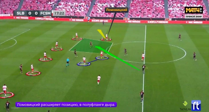 Немного странно, что в ситуациях, когда «Спартак» откровенно садился назад шестёркой, «Бенфика» плохо использовала пространство в опорной зоне и полуфланг за дальним опорником. Если бы португальцы чаще играли через эти зоны – гарантированно выдёргивали бы защитников и создавали дыры. А они по привычным алгоритмам сбились на фланговую игру. Зато первый гол после перерыва состоялся как раз благодаря выдёргиванию Айртона и заполнению полуфлангового пространства.