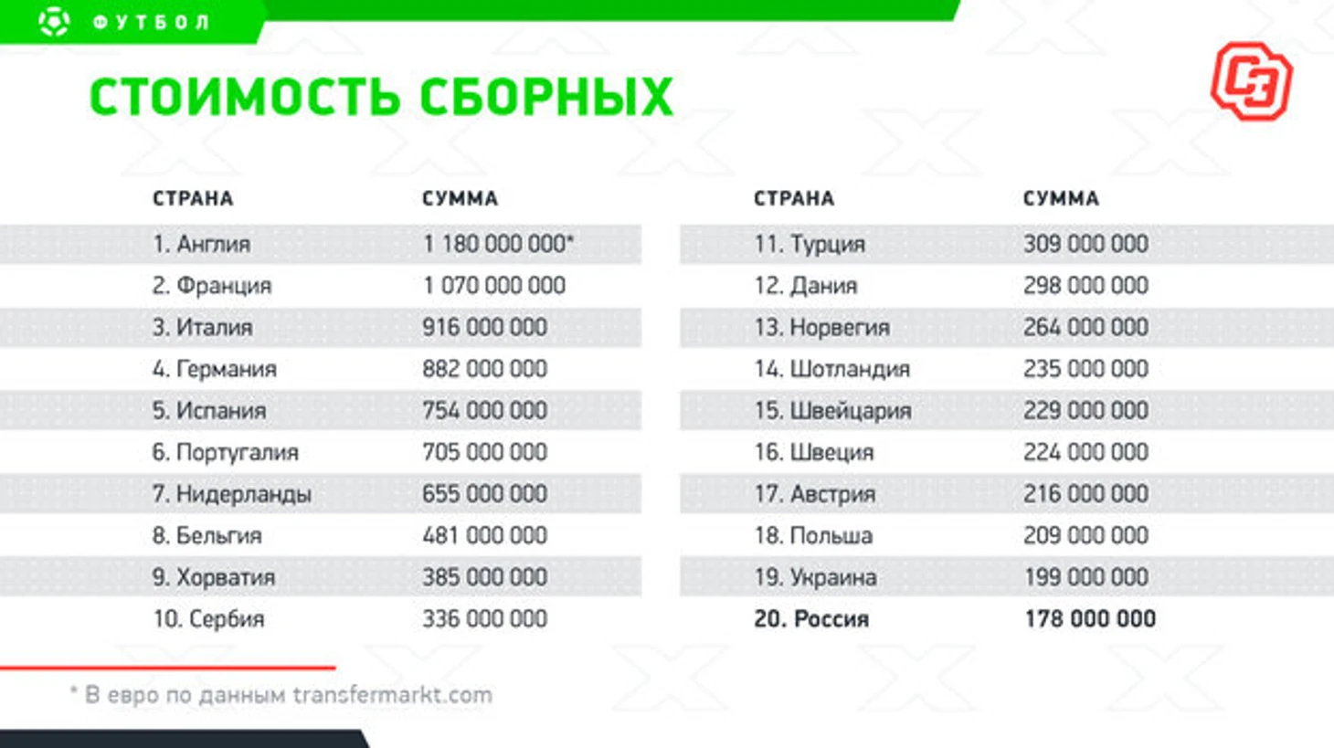 Что касается стоимости сборной, то этот показатель вряд ли кого-то удивит. Данные transfermarkt.com открыты, их может изучить любой желающий. Так вот лучшие российские футболисты оцениваются в 178 миллионов евро. Для сравнения: сборная Норвегии «весит» 264 миллиона, Сербия — 336 миллионов, а Турция — 309 миллионов.