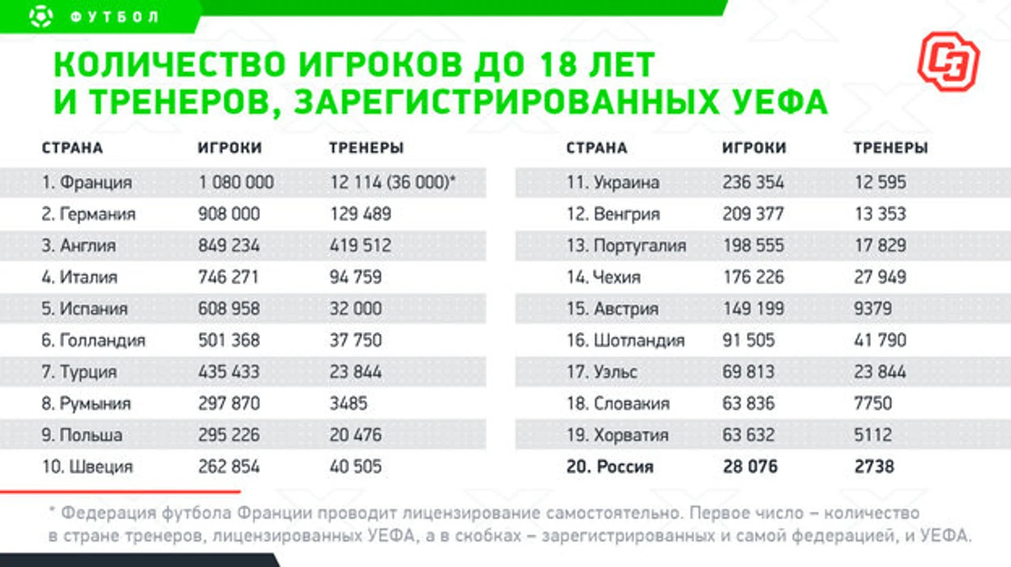 Исходя из данных, предоставленных председателем совета директоров «Спартака», в нашей стране зарегистрировано УЕФА чуть больше 28 тысяч игроков до 18 лет и около 2700 тренеров. Это в два раза меньше, чем в Хорватии и Словакии. В пять раз меньше, чем в Австрии. В десять — чем в Польше. Отставание от ведущих футбольных держав (Германия, Франция, Англия) — несколько порядков.