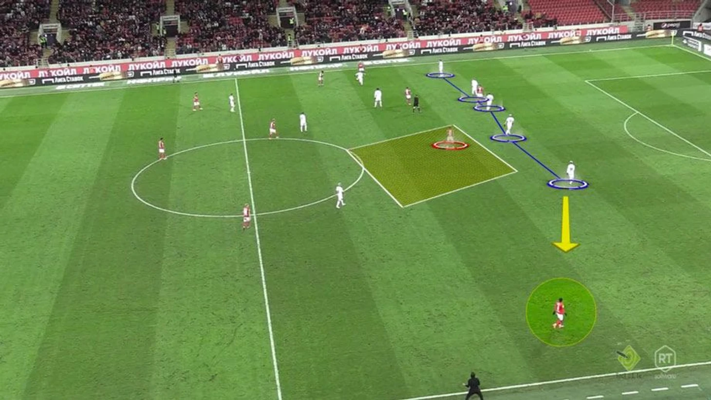 Стремления Ваноли примерно понятны. Он хотел сбалансировать центр поля, снять нагрузку с центральных защитников. Плюс у Зобнина была гибридная роль при обороне. В фазе прессинга (который был не постоянным, а начинался в удобных ситуациях) Роман поднимался в переднюю линию, образовывал тройку с Промесом и Соболевым, помогал давить на центральных защитников. На левого латераля Облякова в таком случае выдвигался Мозес, а по Карраскалю (или Медине) доигрывал Литвинов.
