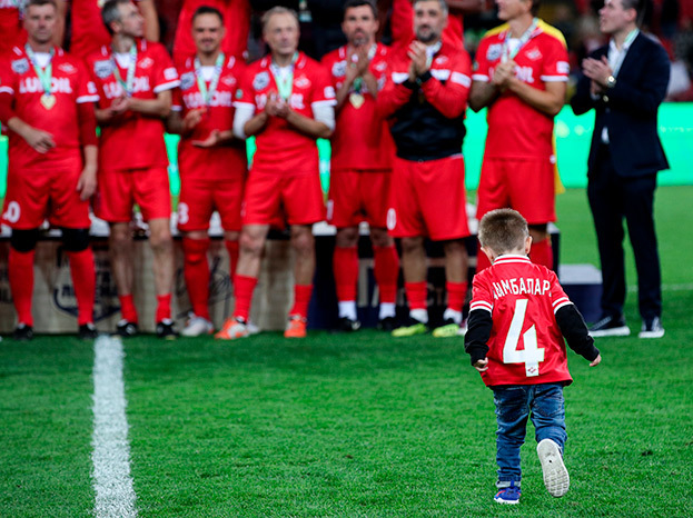 Олег Цымбаларь с сыном на матче памяти полузащитника «Спартака» Ильи Цымбаларя.