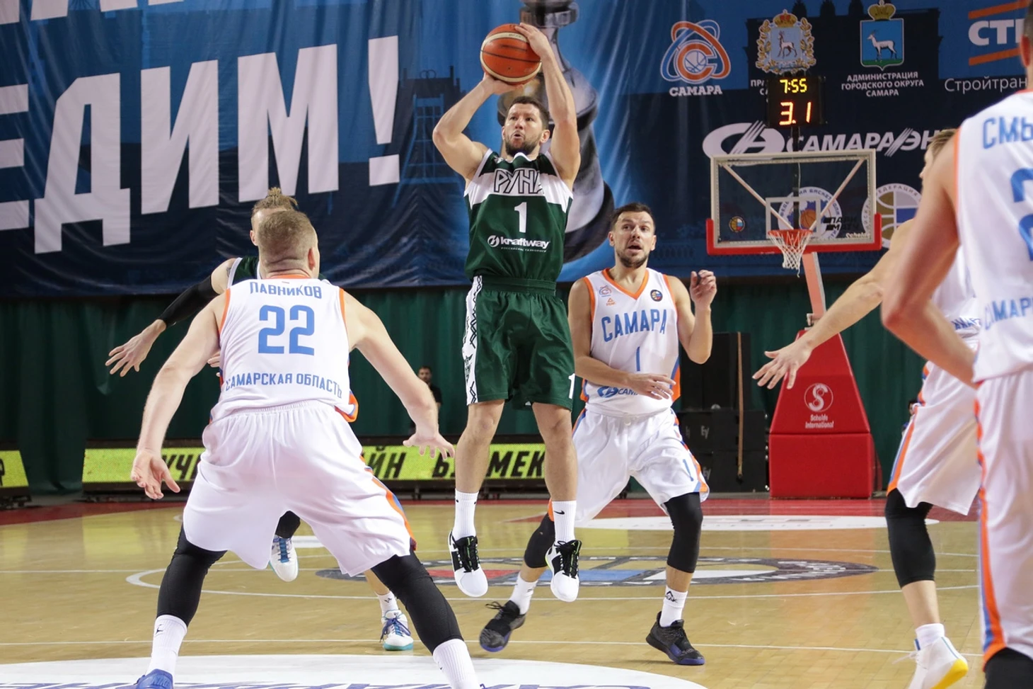 На выездной матч против действующего чемпиона Суперлиги наша команда отправилась сразу после поражения от «Уфимца» (71:62). Оптимизма не добавлял и факт, что на тот момент самарцы ни разу не проигрывали в сезоне. Но запредельный настрой, с которым гости вышли на игру, перечеркнул всё. «Самара» захватила лидерство (14:8 к середине стартового отрезка), и Олег Окулов запросил тайм-аут. «Бело-зелёным» удалось совершить рывок 13:2 благодаря агрессивной защите и 9 очкам Грущенко, уверенно завершавшего из «краски». Хозяева явно не рассчитывали на такое начало встречи, но наших парней в этот вечер было не остановить! Героем второй четверти стал Хаджибекович, вслед за Грущенко продолжавший обозначать преимущество «викингов» в трехсекудной, и преимущество в девять очков по итогам двух четвертей выглядело логичным. Во второй половине наши парни показали эффективную игру в нападении, набрав аж 56 (!) очков и даже выигранная самарцами четвёртая четверть не позволила подопечным Игоря Грачёва спастись. 86:97 - нанесли первое поражение в сезоне лидеру таблице!