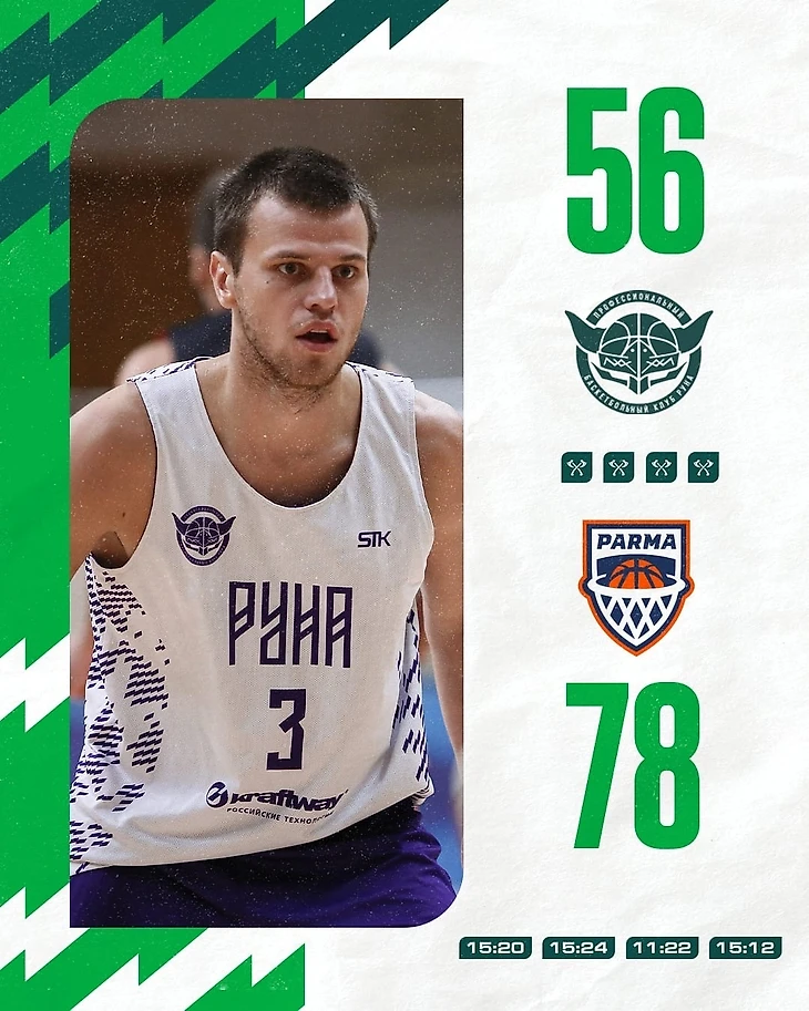 В заключительном матче «Руна» поборолась с командой Единой лиги ВТБ «Парма-PARI». Наши парни не сумели справиться с более опытным соперником и уступили 56:78.