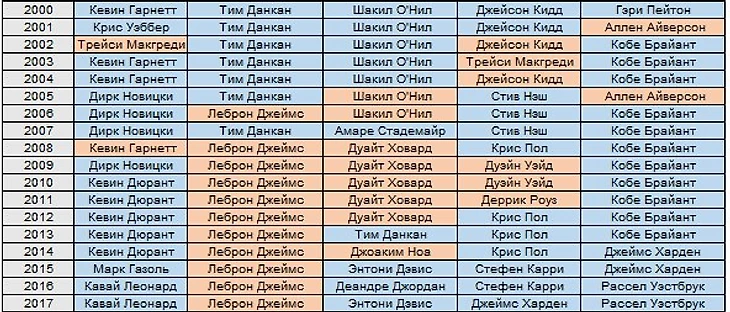 Здесь тоже прослеживается доминирование западной конференции, а в титулах MVP (что регулярного чемпионата, что финальной серии) соотношение такое же как и в итоговых чемпионствах – 12 против 6. Причем, если MVP финальной серии, по традиции, никогда не достается игроку проигравшей команды, то титул MVP регулярного сезона только 10 раз доставался игроку команды-победителя, что странным образом соответствует соотношению побед в регулярном чемпионате – 10 к 8 пользу Запада. Такая вот магия чисел.