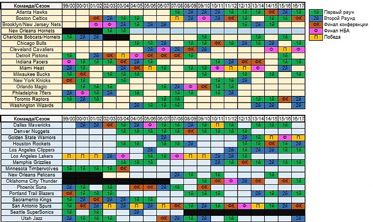 Запад: Minnesota Timberwolves – 5 раз, New Orleans Pelicans и Golden State Warriors – 6 раз. До сезона 12/13 команда из Окленда была абсолютно худшей в НБА, имея всего 1 выход в плей-офф, но за последние пару лет все кардинально изменилось, кто бы мог подумать? А вот болельщикам из Миннеаполиса не позавидуешь, всего 5 участий в плей-офф, и даже не смотря на выход в финал конференции, Timberwolves – худшая команда не только Запада, но и НБА на данный момент.