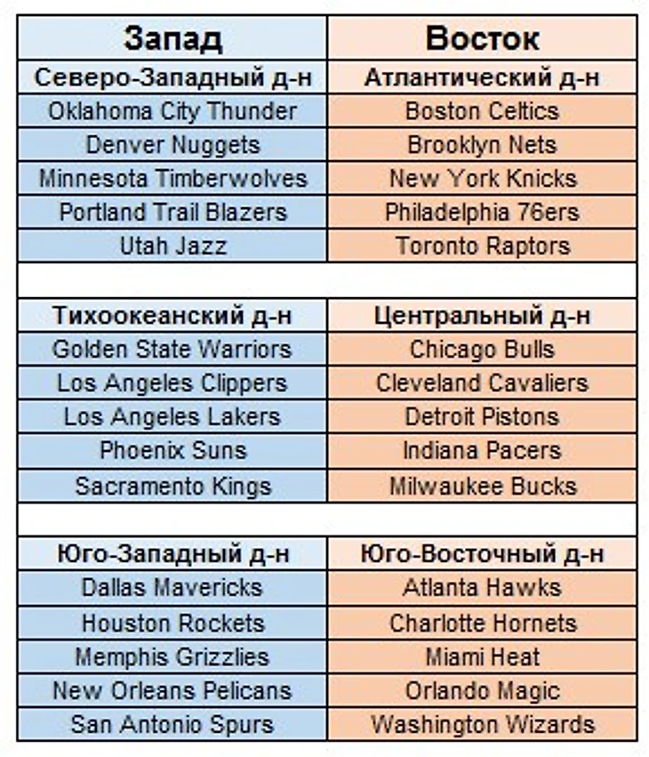 В каждом из районов есть хотя бы один клуб НБА, а сами команды распределены довольно равномерно относительно принадлежности к тому или иному побережью. Более того, состав современных дивизионов на Востоке полностью совпадает с принадлежностью команд тому или иному району. Только Мемфис (штат Теннеси) географически относясь к востоку, представляет Западную конференцию, такой вот "свой среди чужых".