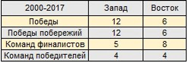 Невооруженным взглядом заметно доминирование Западной конференции. При двукратном превосходстве в титулах, самих команд победителей равное количество, а в разнообразии финалистов Восток и вовсе имеет преимущество, но это довольно слабое утешение, согласитесь.