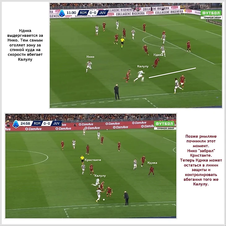 Второе — активные рейды крайних ЦЗ «черно-белых» Пьера Калюлю (справа) и Ллойда Келли (слева) в атаку. И опять, обороне римлян приходится действовать в формате блица «Что? Где? Когда?». Кто будет добегать за этими лазутчиками? Как и кому их передавать? У Манчини и Ндика могда равзиться легкая мигрень.