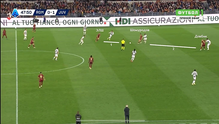2)После выхода Шомуродова у римлян заработал «принцип поршня». Эльдор и Артем двигались вверх-вниз, поочередно выдергивая из обороны одного из ЦЗ «Ювентуса».