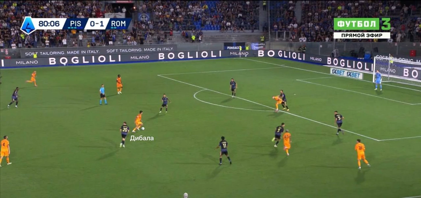 Напоминает классический тренировочный квадрат 4-2. Понятно, что в этом ромбе римляне могут извлечь преимущество в двух сценариях: играя вокруг двух игроков «Пизы» (через Уэсли или Эрмосо) или насквозь передачей на Суле. Но возникает вопрос: на сколько такая конфигурация обоснованна? Игроки «Пизы» обороняются зонно. Футболистам в оранжевом никого запутывать сменой позиции не надо.