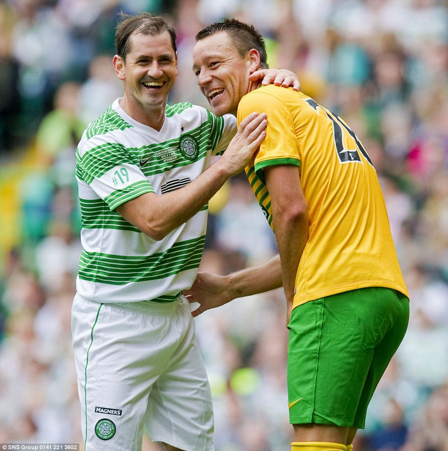 Кэп "Челси" о чем-то шутит с Джеки Макнамара во время благотворительного матча в честь Стиляна Петрова.