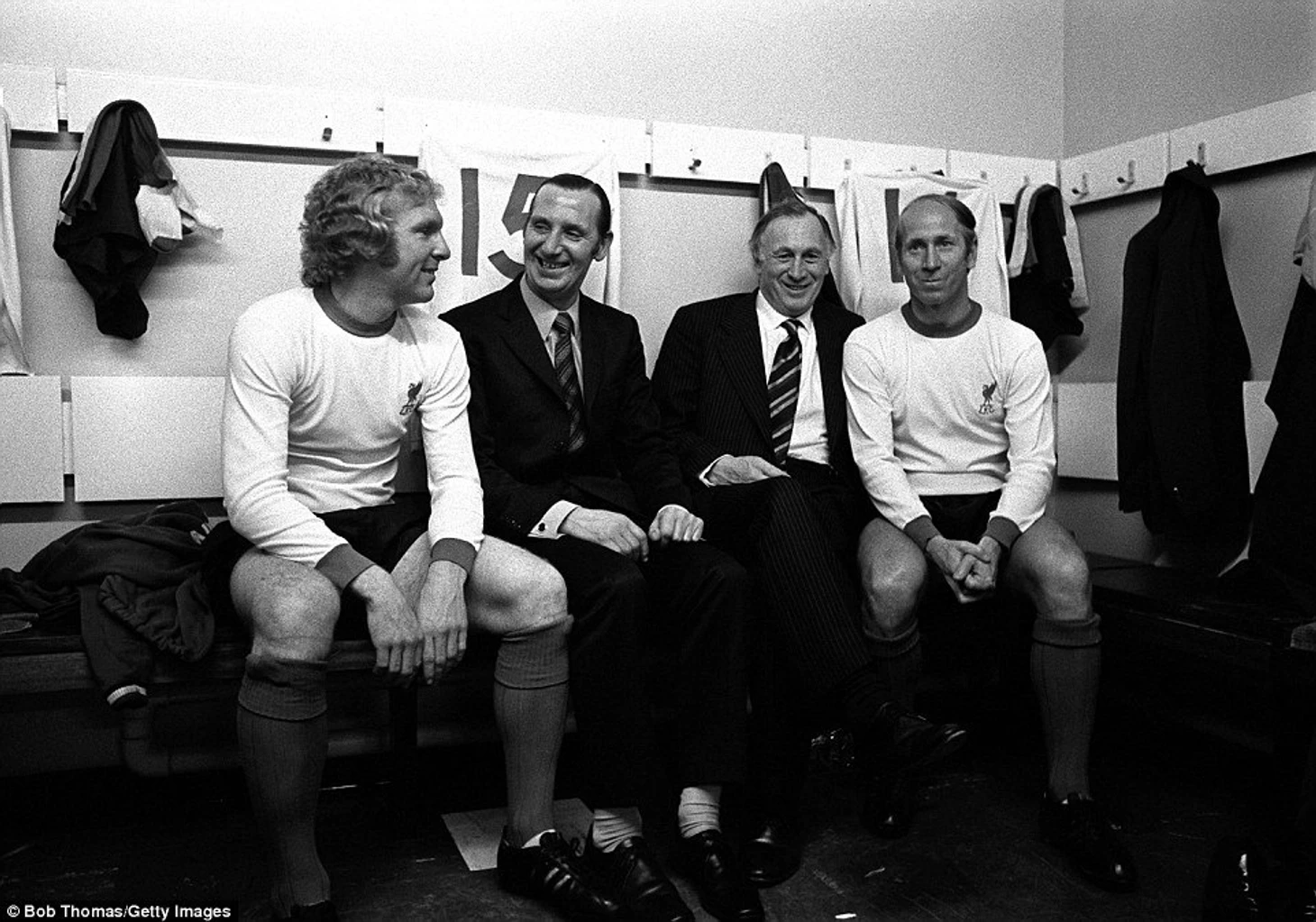 Бобби Мур и сэр Бобби Чарльтон в футболке Ливерпуля. 1972 г.