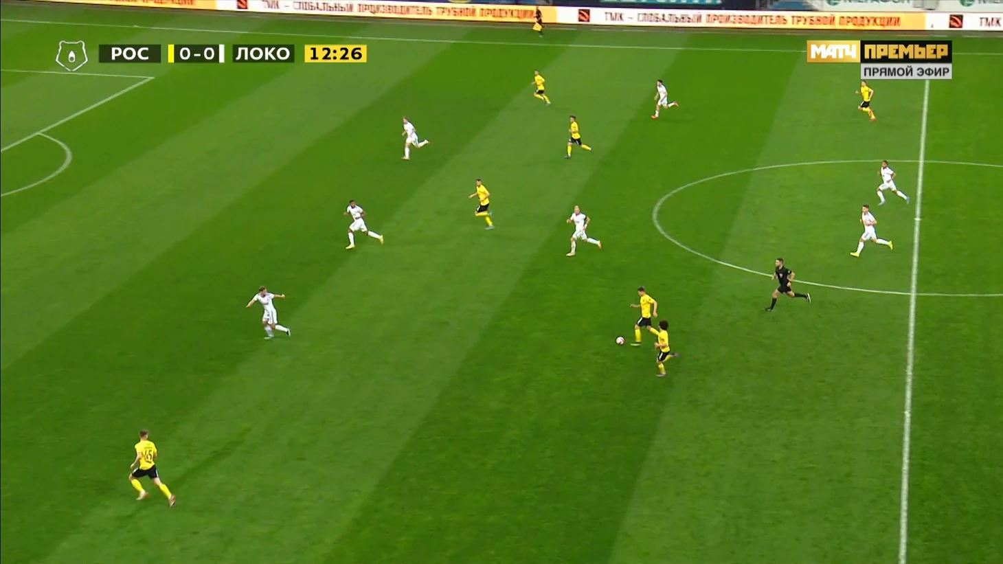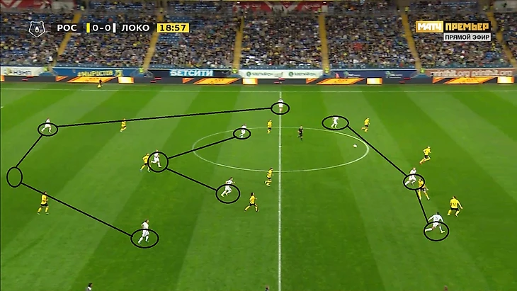 Ростов давил в основном через левый фланг, где располагался атакующий треугольник Сильянов – Байрамян – Полоз. Во многом это было сделано намерено из-за того, что Жемалетдинов часто не дорабатывал в прессинге за Байрамяном или просто не успевал сесть обратно по позиции. По сути структурой своего прессинга Локомотив доставил сам себе проблемы. Акцент был сделан на давление полузащитников и центральных защитников Ростова. При этом оставались свободными Лангович и Сильянов, на которых давления никто не оказывал, это позволяло продвигать мяч вперед и не встречать сопротивление на половине соперника.