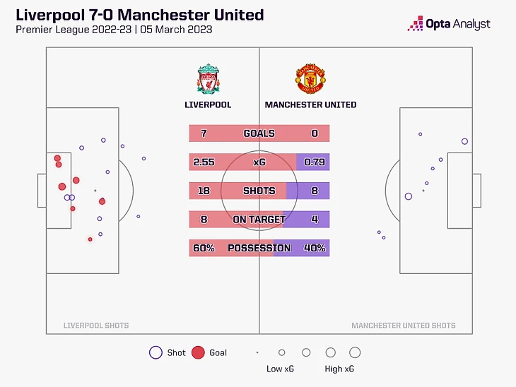 «Вести к перерыву 1:0, при этом иметь статистику ударов 15:0 - это невероятно», - сетовал Клопп после ничьей. «Это индикатор того, что что-то не так с завершением, либо это исключительное вратарское мастерство [как в случае двух сейвов Онаны после ударов Собослаи] - тем не менее, мы должны быть спокойнее и точнее в завершении». Кроме матча в Кубке Англии (23 удара и 2 мяча в основное время), аналогичная картина складывалась в матче первого круга между командами на «Энфилде» - 34 удара по воротам от «Ливерпуля» и ни одного забитого. Пикантности ситуации добавляет тот факт, что такой провал в реализации приходится на сезон, когда «Ливерпуль» борется за титул, а «Юнайтед» - за сохранение места в еврокубках. В прошлом сезоне, когда у «Ливерпуля» дела в турнирной таблице обстояли не лучшим образом, а качество игры «Юнайтед» было явно выше нынешнего, мерсисайдцы буквально уничтожили команду тен Хаага в домашнем матче со счетом 7:0 (xG 2,55). И для этого им понадобилось всего 18 ударов.