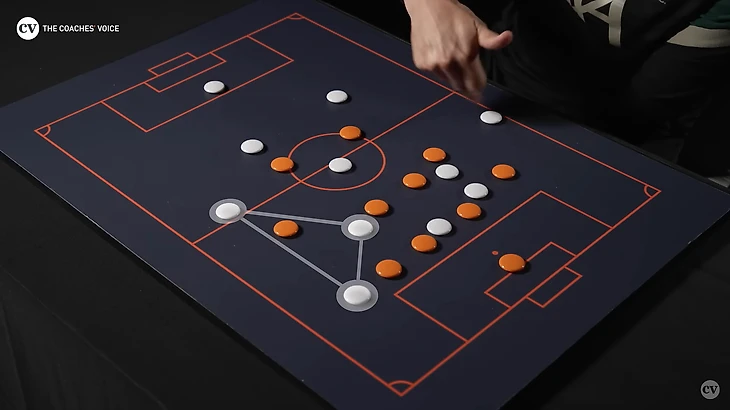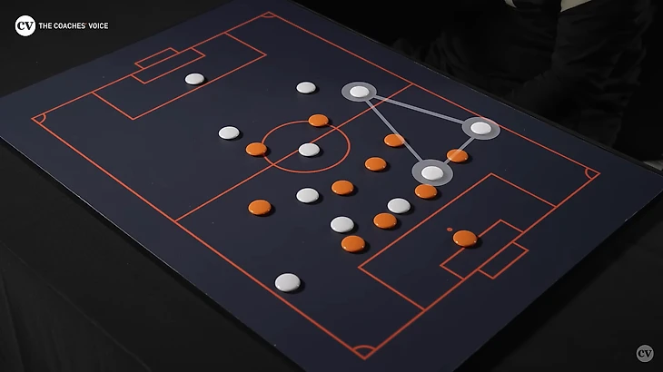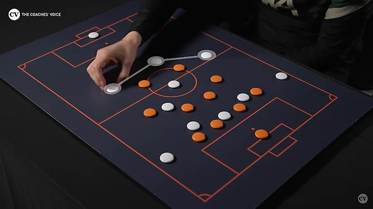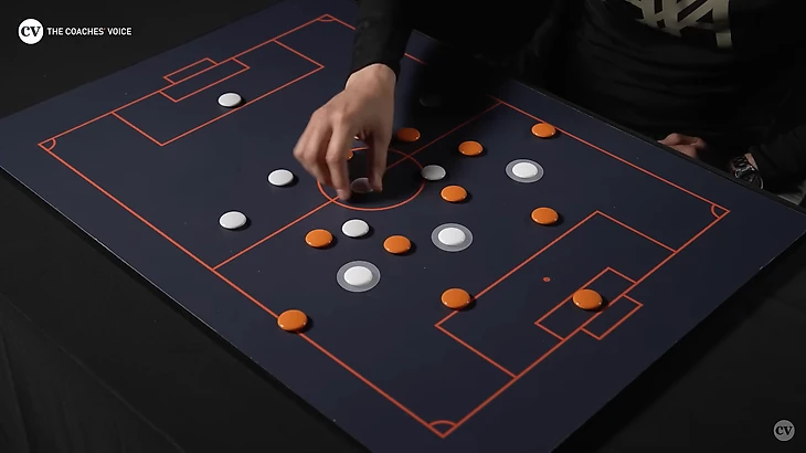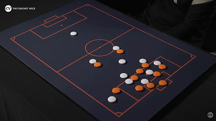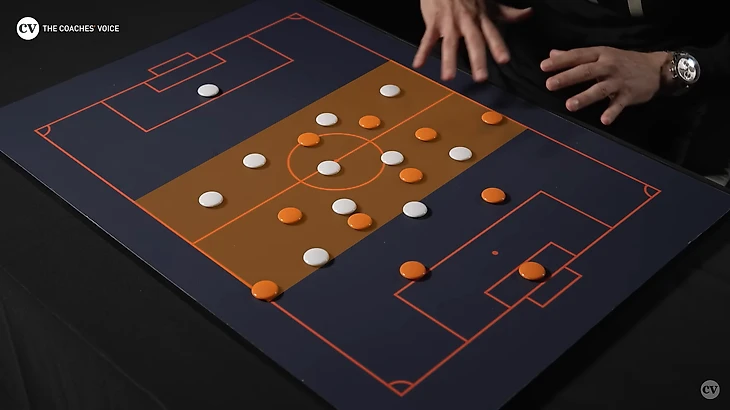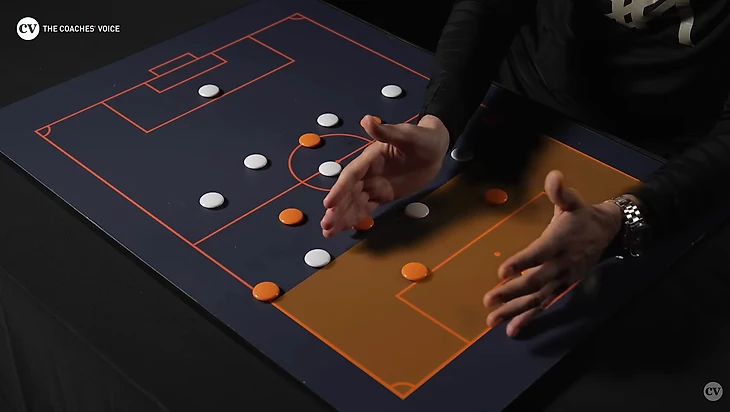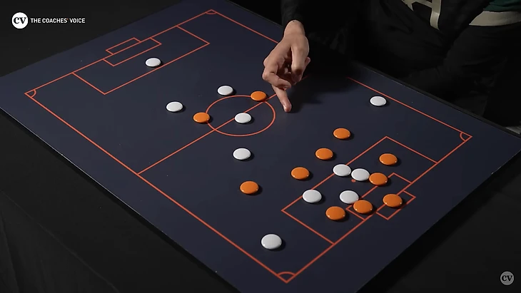 Возвращаясь ко второму блоку - здесь всё проще, поскольку расположение игроков более компактное, это постоянно наигрывается на тренировках в форматах 10v10 или 11v11 в ограниченной зоне:
