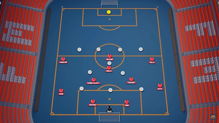 Одновременно это развяжет руки Онана для более активного участия в билдапе в роли одного из центральных защитников, а также обеспечит необходимый перегруз защитной линии соперника.