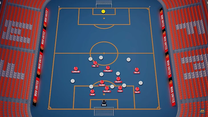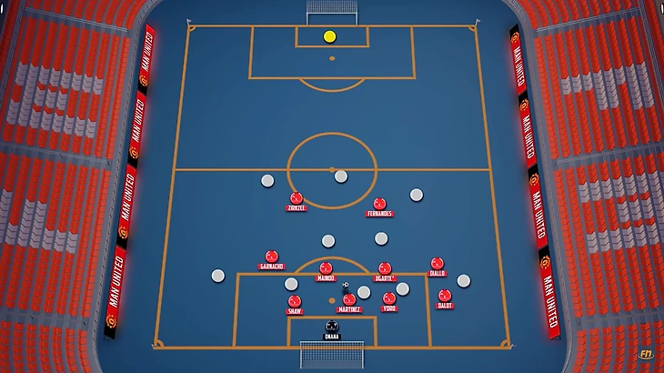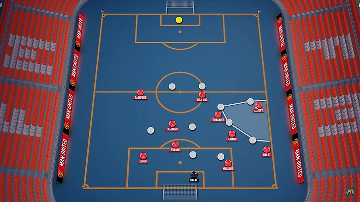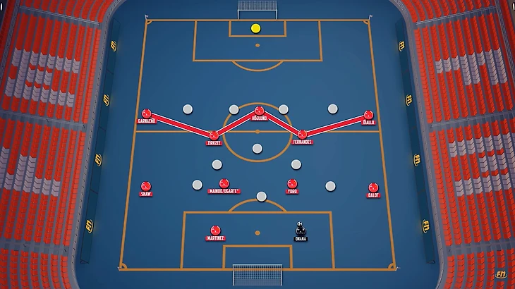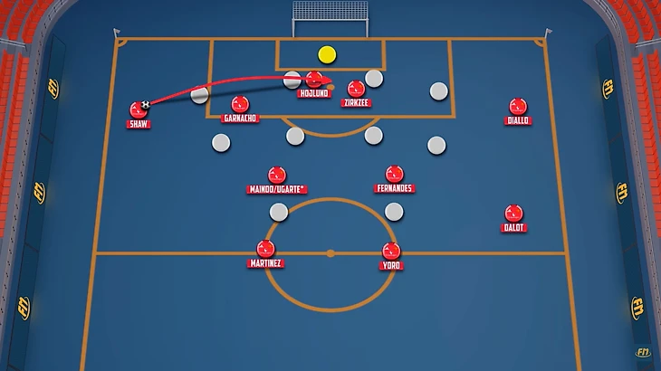 Другая проблема - использование крайних защитников в атаке. Это затрудняется стремлением тен Хаага ставить команде быстрое перемещение мяча (Далот и Шоу просто не будут успевать поддерживать атаки) и риском пропускать контрвыпады соперников только с двумя игроками сзади.